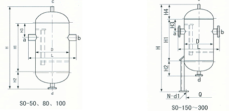 我公司生产的蒸汽分水器参照《石油化工装置工艺管道安装设计手册》第二篇管道器材上的要求定型制造,设计压力为1.3MPa,设计温度为300℃,其分离面积已按蒸汽接管尺寸予以考虑,使用时可直接根据蒸汽管径选用。