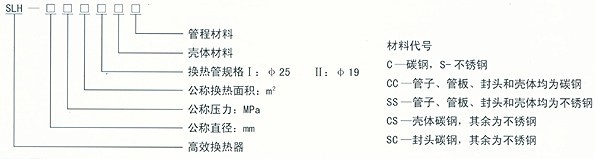 如公称直径为300,公称压力为1.0MPa,换热面积为9m2,换热管规格为ф19,材质:壳体为碳钢,其余为不锈钢的高效换热器,其型号表示为:H300-1.0—911—CS
